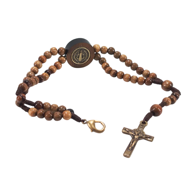 Esta pulseira é uma peça devocional delicada e prática, adequada para uso pessoal ou como um presente significativo para aqueles que têm devoção a São Bento. A combinação de materiais naturais como a madeira e os detalhes em metal ouro velho confere à pulseira um apelo visual único e atemporal.